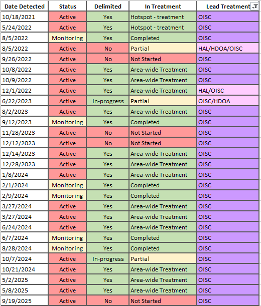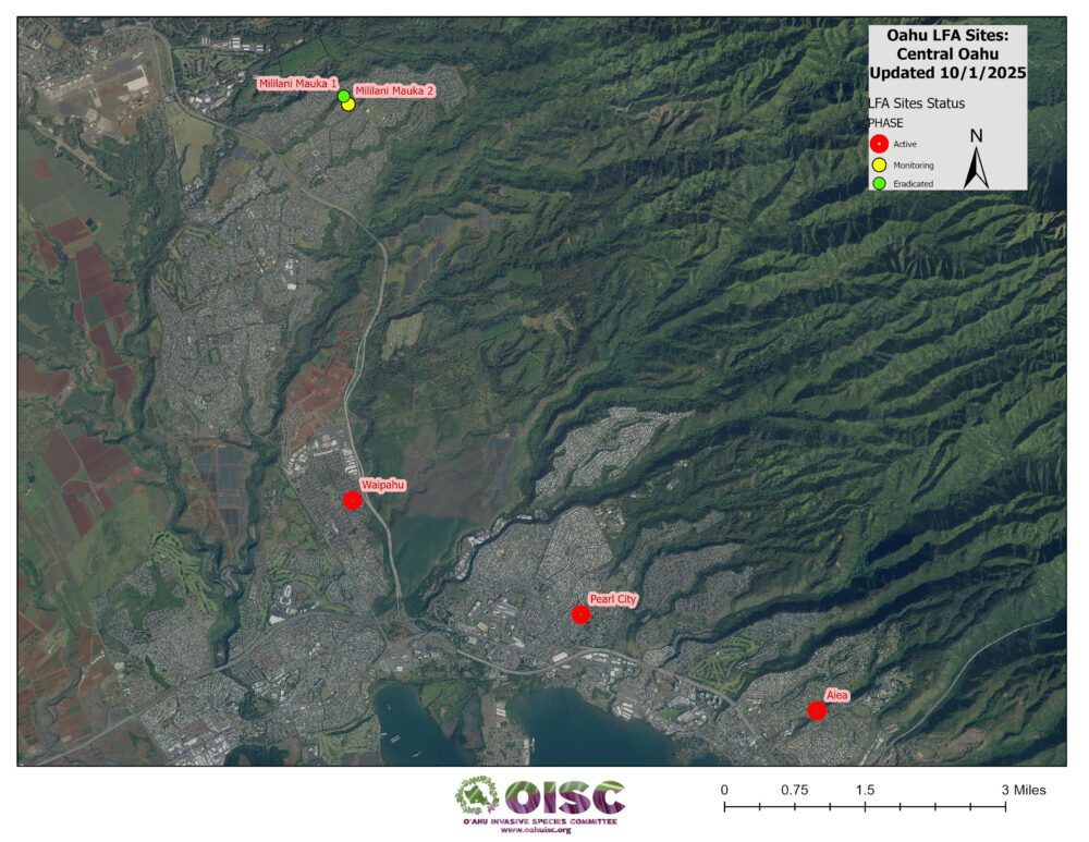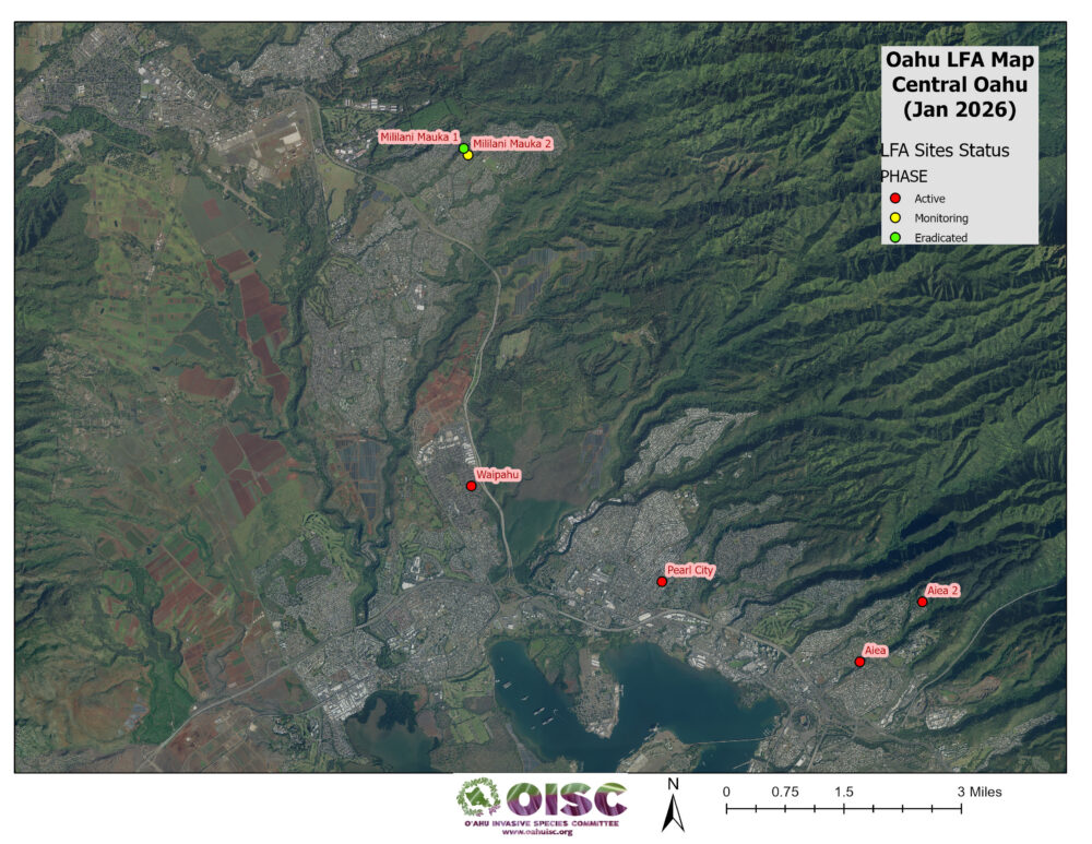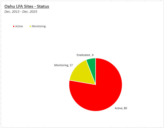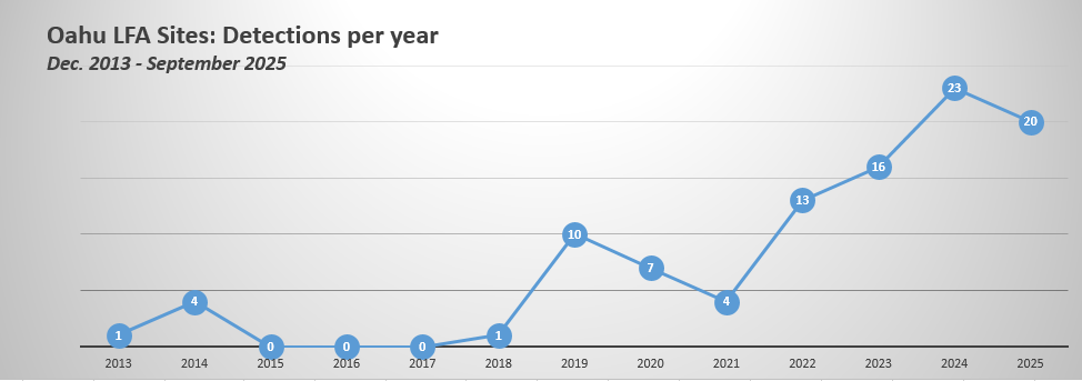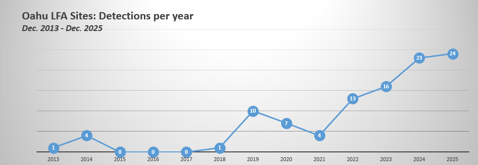 The progression of detections on Oʻahu has been increasing since the first find in December 2013. It is important to address LFA detections with treatments to slow the spread and prevent island-wide establishment.