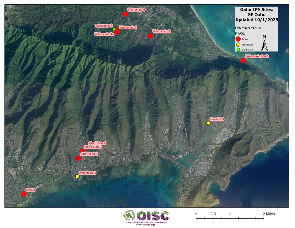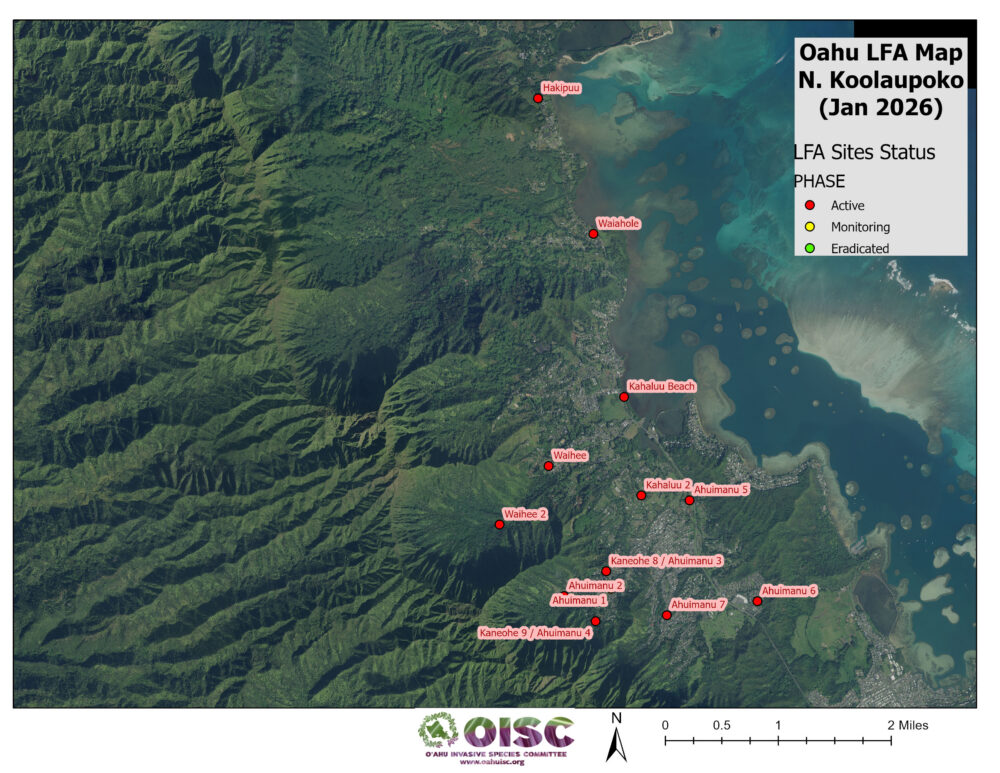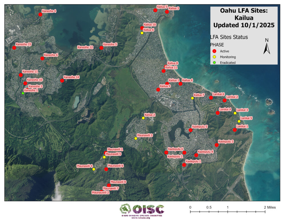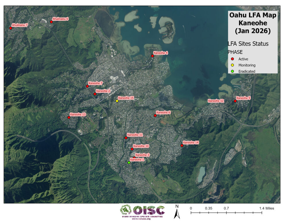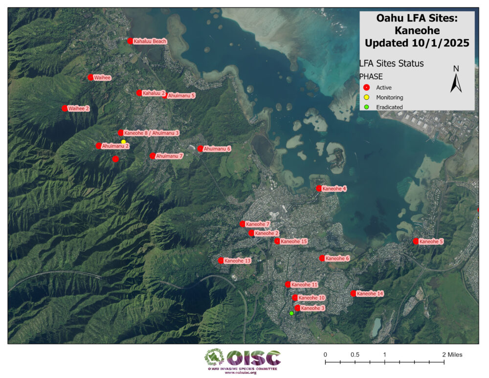 OISC funding for LFA work was implemented in September of 2024 and is geographically specified for the Koʻolaupoko area of windward Oʻahu through a DOD REPI grant. Since then, we have been working through a backlog of sites from Kahaluʻu to Kailua. We are working to get them surveyed to find the edges of the infestation (delimiting) and begin the treatment cycle. Below is a list of our sites and their status.