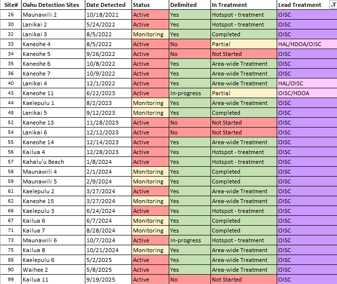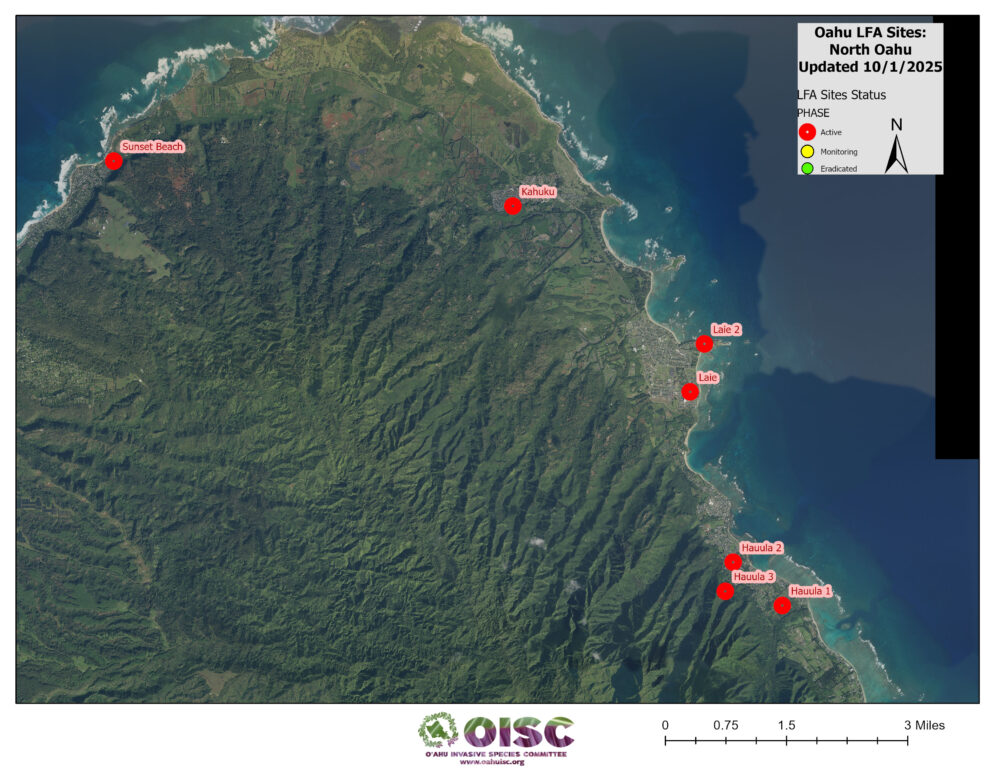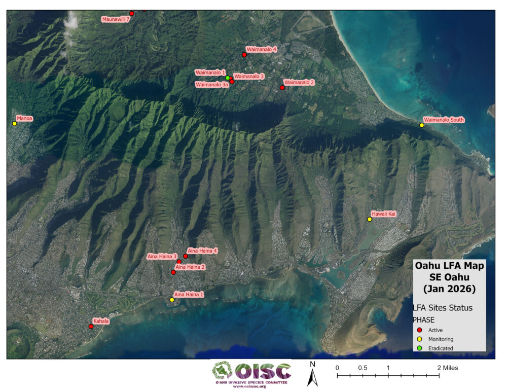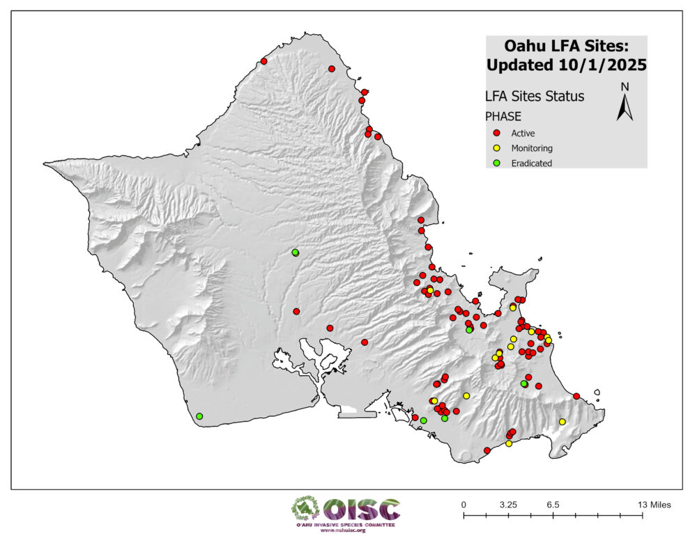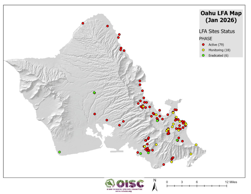 OISC funding for LFA work was implemented in September of 2024 and is geographically specified for the Koʻolaupoko area of windward Oʻahu through a DOD REPI grant. Since then, we have been working through a backlog of sites from Kahaluʻu to Kailua. We are working to get them surveyed to find the edges of the infestation (delimiting) and begin the treatment cycle. Below is a list of our sites and their status.