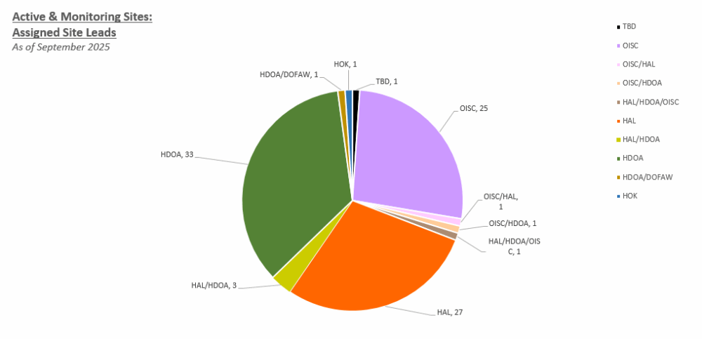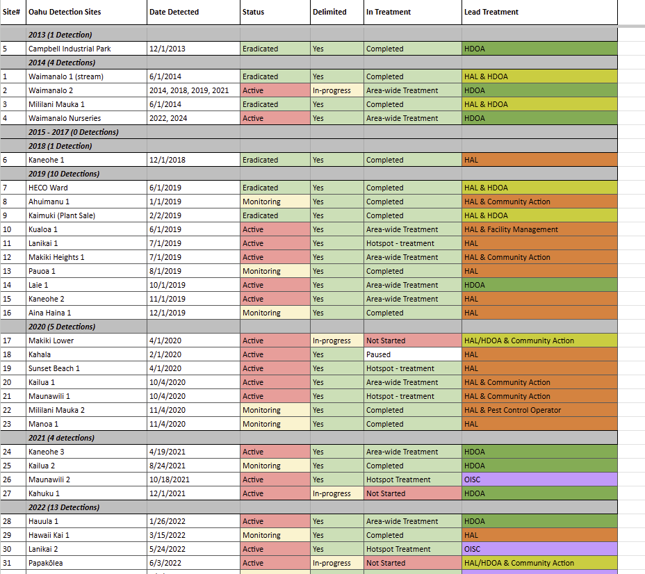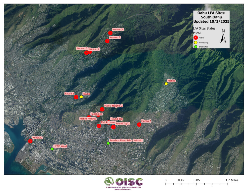 The limited capacity of any single agency doesn’t meet the response needs of detections on O’ahu. As the number of detections grows, the response is a combined effort among several organizations and community leaders using the divide-and-conquer approach. With the help of the affected communities, we are working together to get all detections into treatment and eradicate each infestation. Now, with even more partner support from Hui ʻO Koʻolaupoko (HOK), KEY Project, various pest control operators, and facilities managers, all are collaborating with the site leads to stop LFA.