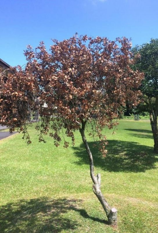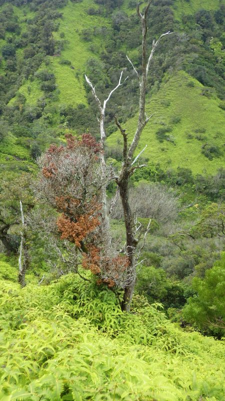 - The entire crown of this ʻōhiʻa has turned brown. Notice the healthy ʻōhiʻa on either side for a comparison.